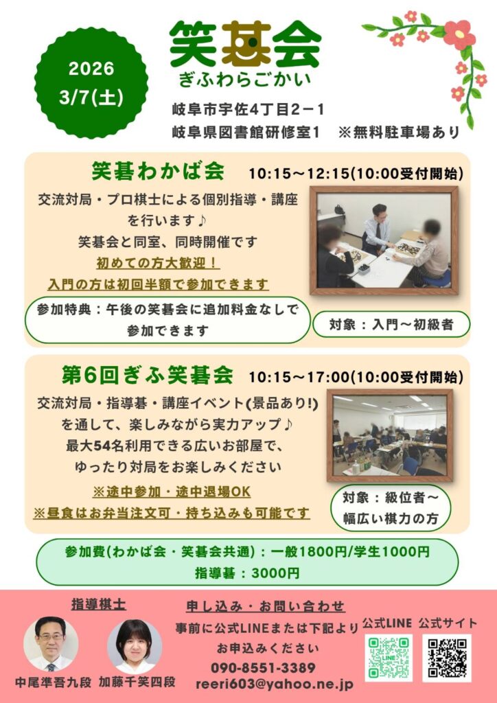 ②公式LINE:ぎふ笑碁会公式LINEはこちらから